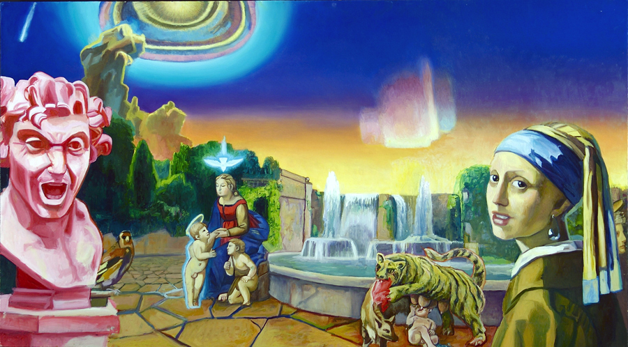 "Allegory, Massacre of the Innocents, oil, 24" x 43", $1800